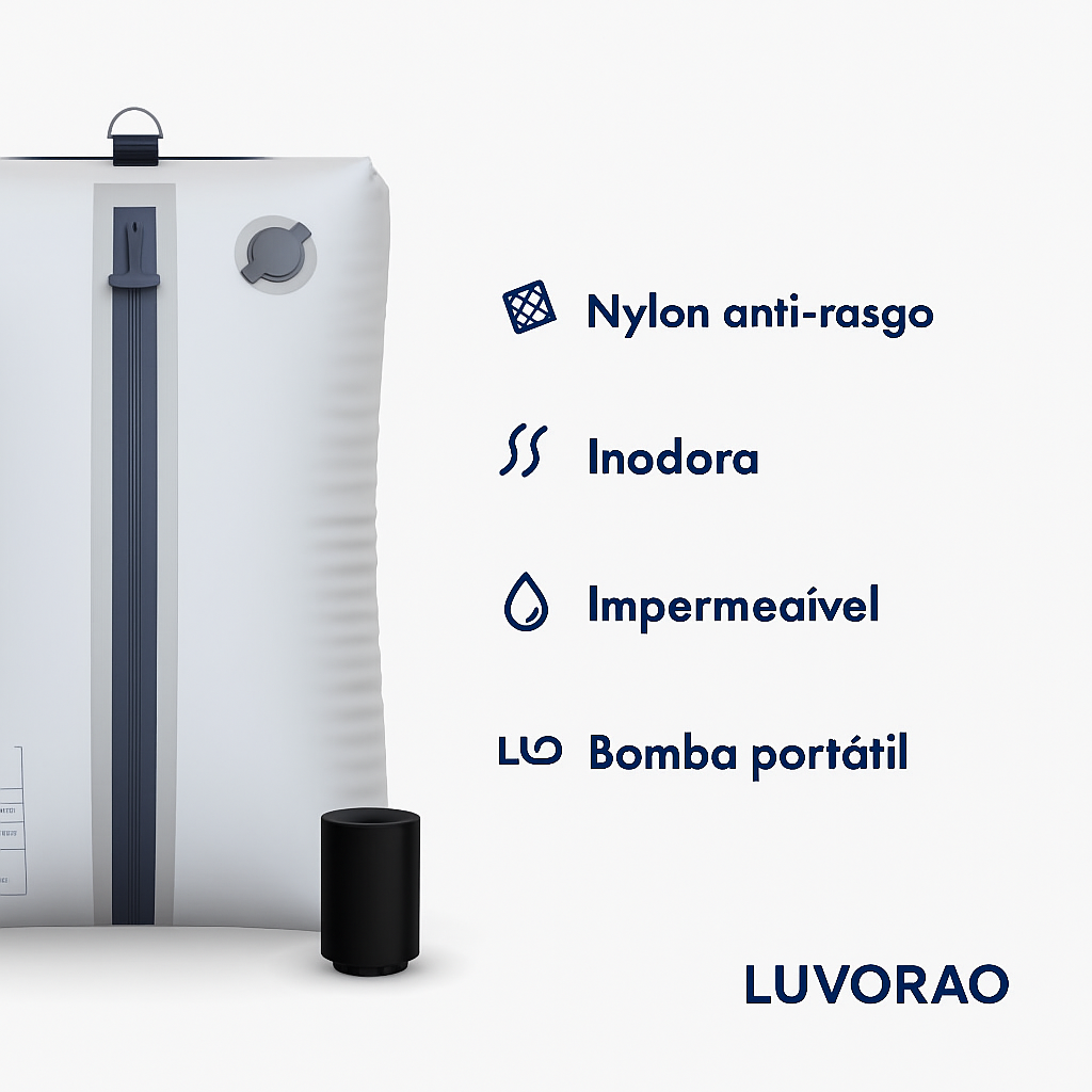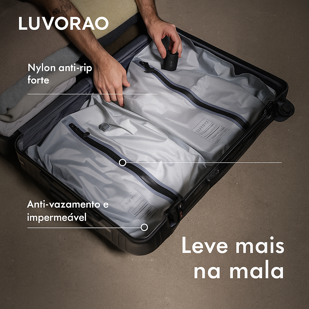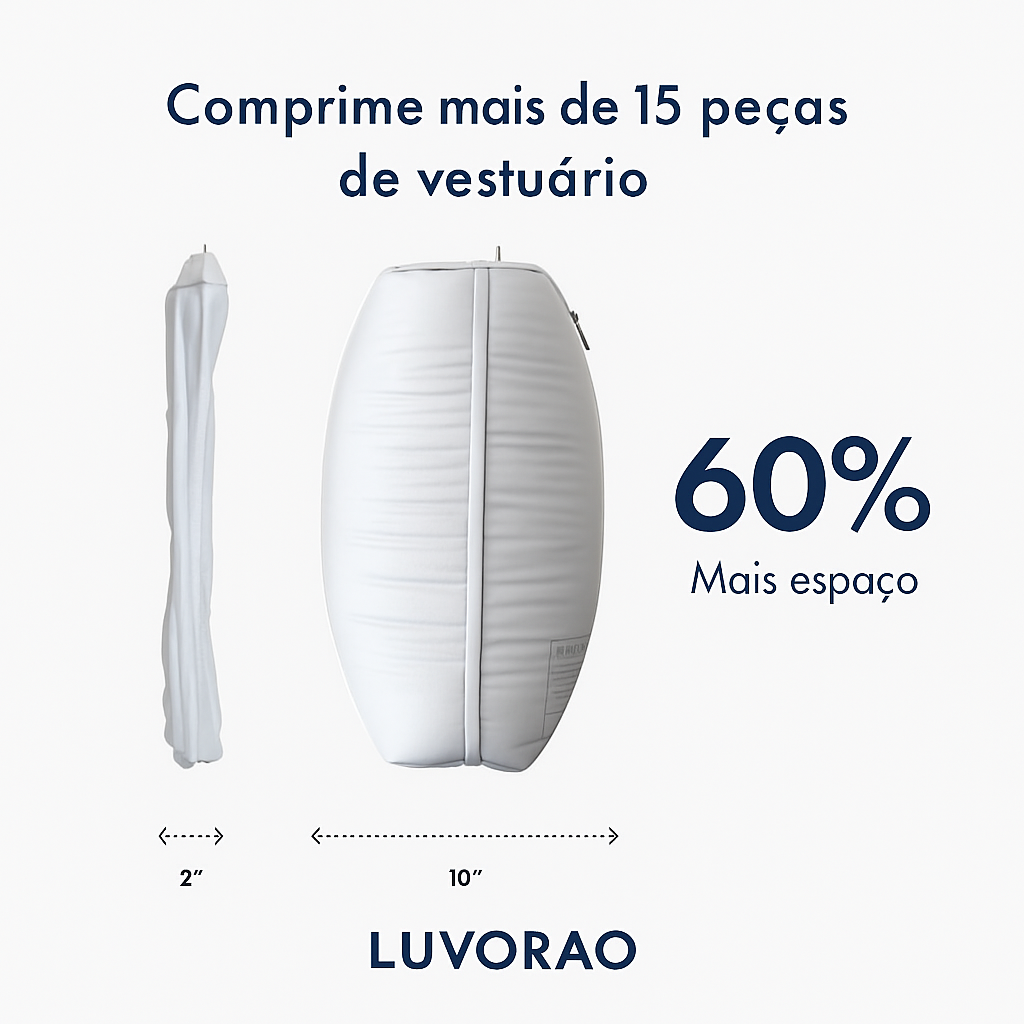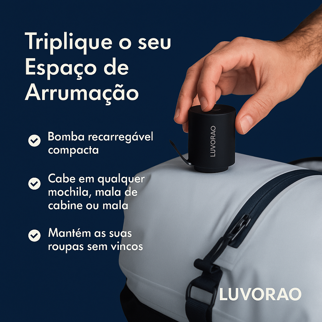 Dica: É possível fazer a compressão manualmente, basta enrolar e pressionar o saco. Mas um conselho: A Bomba Portátil é a melhor aliada para maximizar o efeito e poupar tempo.